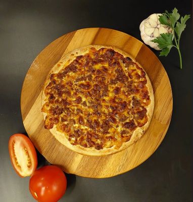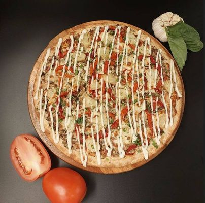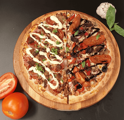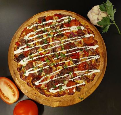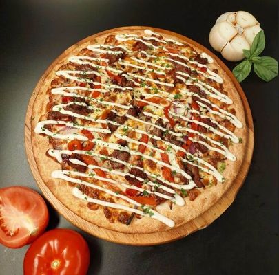 Mediterranean inspired flavours of tender lamb strips on a bed of pizza sauce, roasted red capsicum, Kalamata olives, Spanish red onion and cherry tomatoes. Garnished with Yoghurt and fresh parsley.