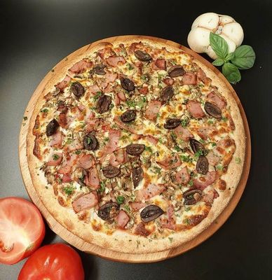 Delicious wood-smoked leg ham, fresh mushrooms and Kalamata olives with crushed garlic, herbs and mozzarella cheese. Garnished with fresh parsley.