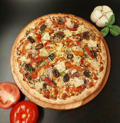 Starting with a pizza sauce base we heap on fresh mushrooms, Spanish red onion, juicy pineapple, Kalamata olives, roasted red capsicum, crushed garlic, herbs and melted mozzarella cheese. Garnished with parmesan and fresh parsley.