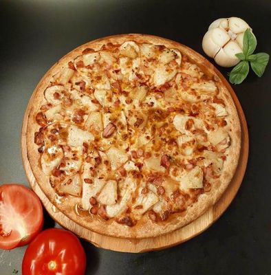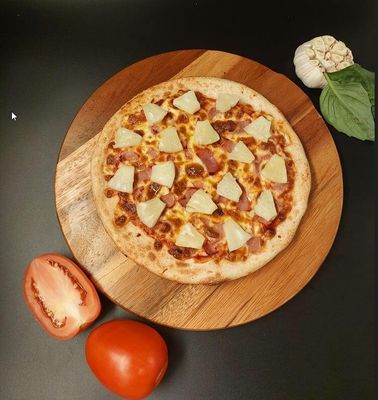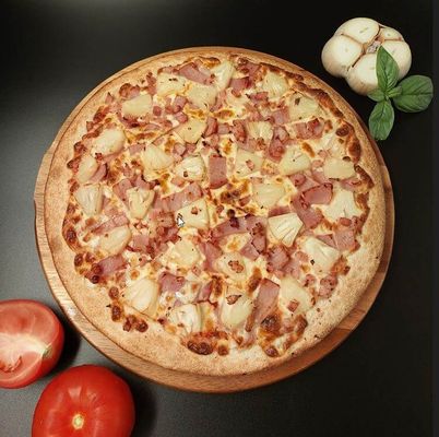 A Hawaiian-style pizza with wood-smoked leg ham, juicy pineapple, crispy diced bacon atop a pizza sauce base. Covered with generous amounts of mozzarella cheese.