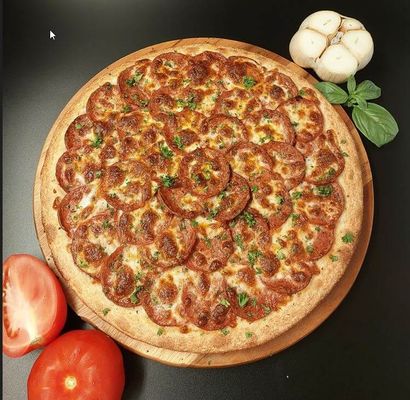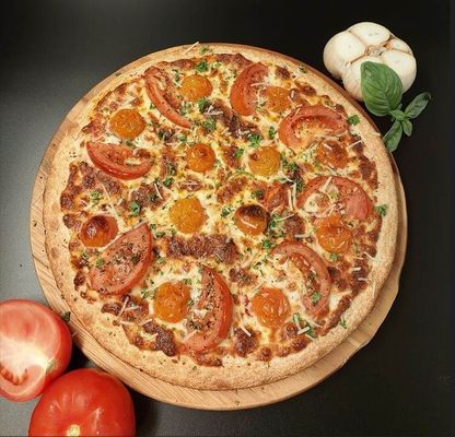 A marriage of Roma tomatoes and cherry tomatoes on a pizza sauce base. Infused with crushed garlic, fresh basil and herbs all topped mozzarella cheese. Garnished with fresh parsley and parmesan cheese.