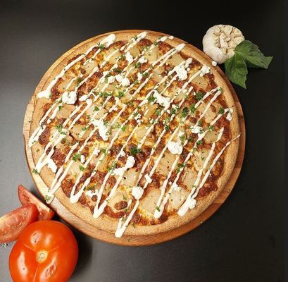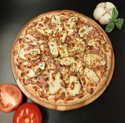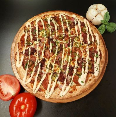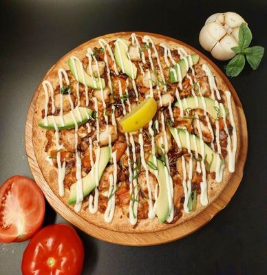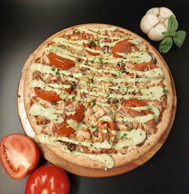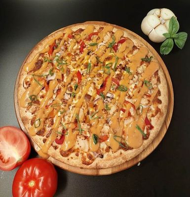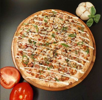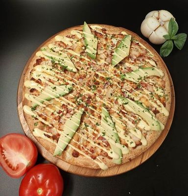 A rich pizza sauce base with oven-roasted chicken, sliced avocado, Spanish red onion and crispy diced bacon. Topped with mozzarella cheese, creamy camembert and garnished with Hollandaise sauce and fresh parsley.
