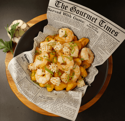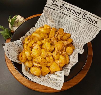 Gnocchi and a cream and tomato fused pasta sauce with juicy prawns, tender slices of calamari, crushed garlic, fresh shallots, butter and parmesan cheese.