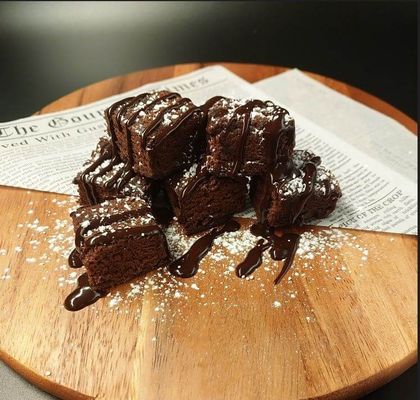 Six decadent chocolate brownies dusted with icing sugar and served with a chocolate dipping pot.