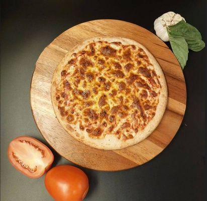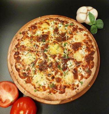 For the cheese lovers we start with a pizza sauce base and cover it with melted mozzarella, parmesan, camembert and feta cheeses. Garnished with fresh parsley.
