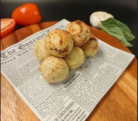 Seven perfectly roasted arancini balls filled with a rich blend of cheeses served on a bed of spinach.