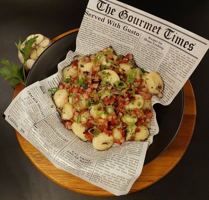Gnocchi with cream sauce, fresh mushrooms, parmesan cheese, shallots, butter and cracked pepper. Topped with garlic infused crispy diced bacon and garnished with fresh parsley.