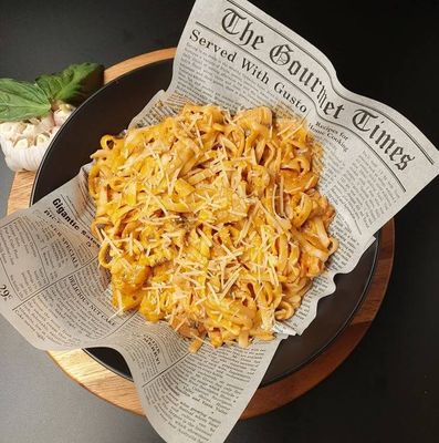 Linguine with a combination of cream and tomato pasta sauces with fresh mushrooms, juicy pineapple, juicy chicken, crushed garlic and parmesan.