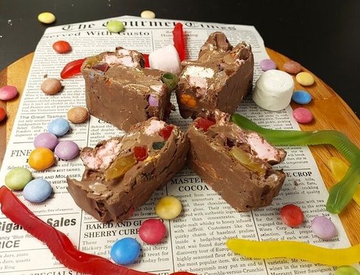 House-made Rocky Road using Cadbury milk chocolate, marshmallows, Smarties and Snakes Alive lollies.