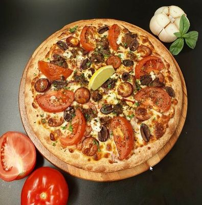 A bed of pizza sauce, fresh basil and dairy-free cheese topped with fresh mushrooms, Spanish red onions, roasted red capsicum, Kalamata olives, Roma tomatoes, crushed garlic and herbs. Garnished with a balsamic glaze and fresh parsley.