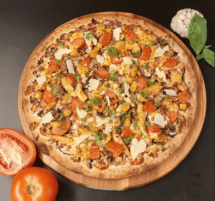 A chicken flavour classic of rich pizza sauce, juicy seasoned chicken, Spanish red onion, fresh mushrooms and freshly diced tomato covered in melted mozzarella cheese and garnished with parmesan and fresh parsley.