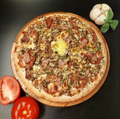 An orgy of fresh mushrooms on a bed of pizza sauce partnered with wood-smoked leg ham, sliced savoury pepperoni, crushed garlic, herbs, melted mozzarella and camembert cheeses. Lovingly garnished with fresh parsley.