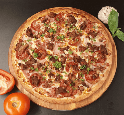 Enjoy slices of savoury pepperoni, succulent wood-smoked leg ham, fresh mushrooms, roasted red capsicum, Spanish red onion, Kalamata olives and mozzarella cheese atop a pizza sauce base. Infused with crushed garlic and herbs and garnished with fresh parsley parmesan cheese garnish.