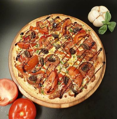 A bed of pizza sauce and fresh basil with sliced savoury pepperoni, Spanish red onions, roasted red capsicum, Kalamata olives, Roma tomatoes, crushed garlic and herbs all covered in mozzarella cheese. Garnished with a balsamic glaze, parmesan and fresh parsley.