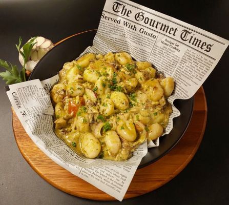 Gnocchi with a combination of cream and tomato pasta sauces with fresh mushrooms, juicy pineapple, juicy chicken, crushed garlic and parmesan.