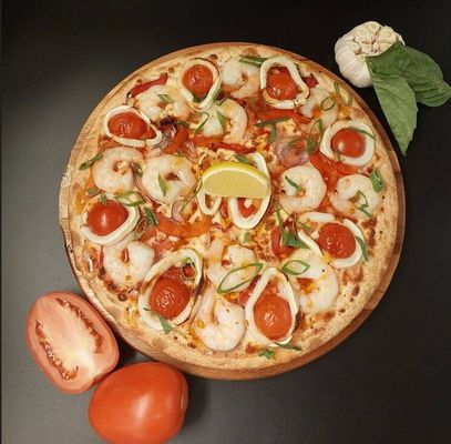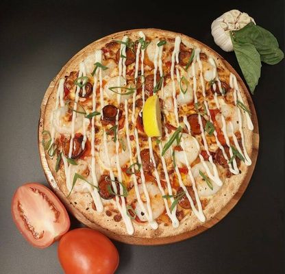 A pizza sauce base featuring juicy prawns, tender slices of calamari, roasted red capsicum, Spanish red onions, cherry tomatoes, melted mozzarella cheese, lemon pepper seasoning and sweet chilli sauce. Garnished with fresh shallots and a lemon wedge.