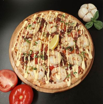 A pizza sauce base with sliced rump beef, Spanish red onion, roasted red capsicum and crispy diced bacon. Joined by juicy prawns dusted with lemon pepper and Cajun seasoning sitting atop a layer of melted mozzarella cheese. Garnished with fresh shallots, creamy Hollandaise sauce and a wedge of lemon.