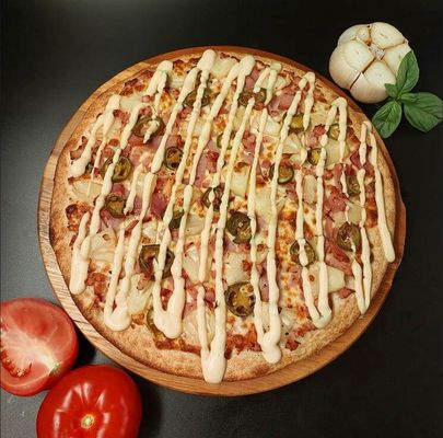 Not the Hawaiian pizza for the kids! We've added some fire to our classic Hawaiian with spicy jalapenos and a Peri Peri mayo garnish for that extra kick.