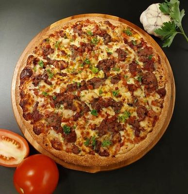 A medley of BBQ sauce, savoury pepperoni, wood-smoked leg ham, sliced rump beef, melted mozzarella cheese and crispy diced bacon. Garnished with fresh parsley.